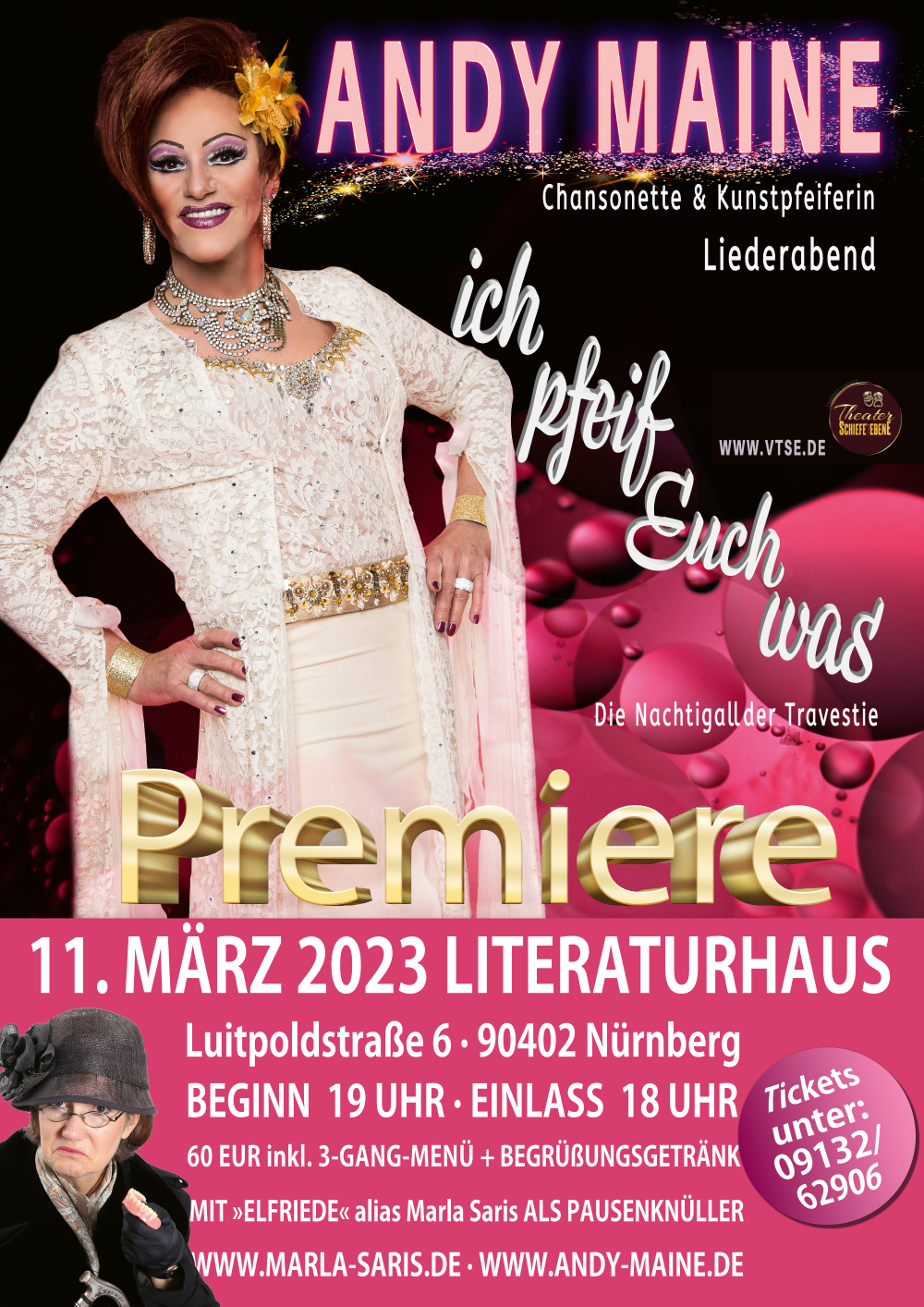 Mit Andy Maine und »Elfriede« prallen am 11. März zwei Welten aufeinander. Die eine steht als gefragte Chansonette und Kunstpfeiferin auf der Bühne – top geschminkt und in Weltklasse-Outfits – während die andere eher aus dem letzten Loch pfeift, also bildlich gesprochen. Aber in Sachen Schlagfertigkeit lässt sich die Alte von niemandem die Wurst vom Brot nehmen.
